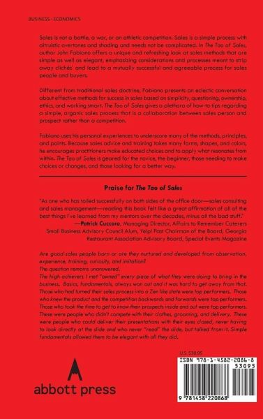 Sales is not a battle, a war, or an athletic competition. Sales is a simple process with altruistic overtones and shading and needs not be complicated. In The Tao of Sales, author John Fabiano offers a unique and refreshing look at sales methods that are simple as well as elegant, emphasizing considerations and processes meant to strip away clichés’ and lead to a mutually successful and agreeable process for sales people and buyers. Different from traditional sales doctrine, Fabiano presents an eclectic conversation about effective methods for success in sales based on simplicity, questioning, ownership, ethics, and working smart. The Tao of Sales gives a plethora of how-to tips regarding a simple, organic sales process that is a collaboration between sales person and prospect rather than a competition. Fabiano uses his personal experiences to underscore many of the methods, principles, and points. Because sales advice and training takes many forms, shapes, and colors, he encourages practitioners make educated choices and to apply what resonates from within. The Tao of Sales is geared for the novice, the beginner, those needing to make choices or changes, and those looking for a better way. Praise for The Tao of Sales "As one who has toiled successfully on both sides of the office door—sales consulting and sales management—reading this book felt like a great affirmation of all of the best things I’ve learned from my mentors over the decades, minus all the bad stuff." —Patrick Cuccaro, Managing Director, Affairs to Remember Caterers Small Business Advisory Council Alum, Yelp! Past Chairman of the Board, Georgia Restaurant Association Advisory Board, Special Events Magazine Are good sales people born or are they nurtured and developed from observation, experience, training, curiosity, and imitation? The question remains unanswered. The high achievers I met "owned" every piece of what they were doing to bring in the business. Basics, fundamentals, always won out and it was hard to get away from that. Those who had turned their sales process into a Zen like state were top performers. Those who knew the product and the competition backwards and forwards were top performers. Those who took the time to get to know their prospects inside and out were top performers. These were people who didn’t compete with their clothes, grooming, and delivery. These were people who could deliver their presentations with their eyes closed, never having to look directly at the slide and who never "read" the slide, but talked from it. Simple fundamentals allowed them to be elegant with all they did.