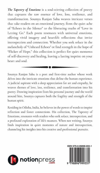 The Tapestry of Emotions is a soul-stirring collection of poetry that captures the raw essence of love, loss, resilience, and transformation. Soumya Ranjan Sahu weaves intricate verses that take readers on an emotional journey, from the quiet ache of "Echoes in the Silence" to the liberating truths of "Love in Letting Go." Each poem resonates with universal emotions, offering vivid imagery and heartfelt reflections that invite introspection and connection. Whether you seek solace in the melancholy of "Unheard Echoes" or find strength in the hope of "Flicker of Hope," this collection is perfect for quiet moments of self-discovery and healing, leaving a lasting imprint on your heart and soul.