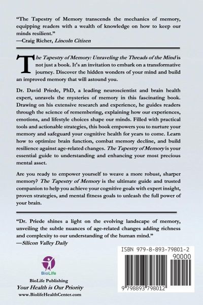 "The Tapestry of Memory" is not merely a book; it is a scientifically grounded exploration of memory's intricate mechanisms and a guide to optimizing cognitive function. Dr. David Priede, a distinguished neuroscientist and leading authority on brain health, looks into the neural underpinnings of memory formation, consolidation, and retrieval. Drawing upon cutting-edge research and clinical experience, Dr. Priede illuminates how experiences, emotions, and lifestyle factors dynamically shape our cognitive landscape. This comprehensive guide offers readers evidence-based strategies to enhance memory performance and promote long-term brain health. Through targeted interventions and personalized approaches, learn to harness neuroplasticity, the brain's remarkable ability to adapt and change. Discover how to mitigate age-related cognitive decline and build resilience against neurodegenerative diseases. "The Tapestry of Memory" empowers individuals to take charge of their cognitive well-being and unlock their full mental potential. Whether you seek to improve focus, sharpen recall, or safeguard your cognitive health for the future, this book provides the knowledge and tools to weave a more robust, more vibrant tapestry of memory.