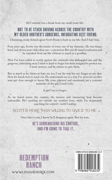 All I wanted was a break from my small town life. Not to be stuck driving across the country with my older brother's gorgeous, infuriating best friend. Charming, cocky federal agent Scott Dunn is back in my life. And I hate him. Four years ago, Scotty was the center of every one of my fantasies. He was funny, kind, and eleven years older than me-a protector. But one ill-timed confession and he vanished from my life without so much as a goodbye. Now I am called to testify against the men who kidnapped me and the gorgeous, infuriating man I tried so hard to forget is assigned to protect me. I want answers and he refuses to give them. But as much as he claims to hate me too, I see the way his eyes linger on my skin. How his hands itch to reach out. He understands me in a way I've never let another man get close enough to know. My scars, physical and emotional, are a constant reminder of the girl I used to be. A girl I try to forget. As we travel across the country, the tension and simmering heat becomes unbearable. He's pushing me outside my comfort zone while I'm desperately searching for control--until I realize Scott is more than willing to give it to me. Once this is over, I know he'll disappear again. But for now, he's surrendering his control, and I'm going to take it.