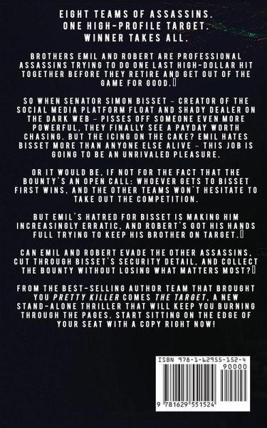 Eight teams of assassins. One high-profile target. Winner takes all. Brothers Emil and Robert are professional assassins trying to do one last high-dollar hit together before they retire and get out of the game for good. So when Senator Simon Bisset - creator of the social media platform Float and shady dealer on the dark web - pisses off someone even more powerful, they finally see a payday worth chasing. But the icing on the cake? Emil hates Bisset more than anyone else alive - this job is going to be an unrivaled pleasure. Or it would be, if not for the fact that the bounty's an open call: whoever gets to Bisset first wins, and the other teams won't hesitate to take out the competition. But Emil's hatred for Bisset is making him increasingly erratic, and Robert's got his hands full trying to keep his brother on target. Can Emil and Robert evade the other assassins, cut through Bisset's security detail, and collect the bounty without losing what matters most? From the best-selling author team that brought you Pretty Killer comes The Target, a new stand-alone thriller that will keep you burning through the pages. Start sitting on the edge of your seat with a copy right now!