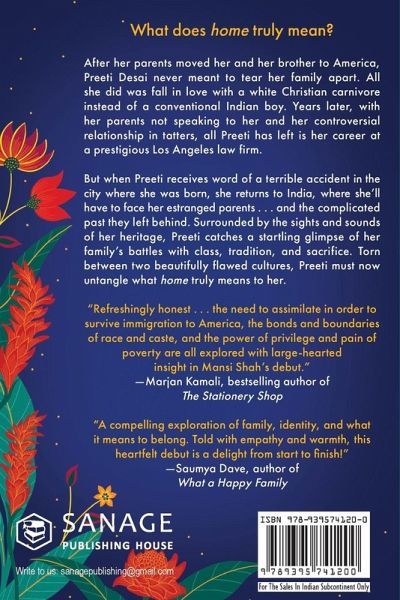 In Mansi Shah's stunning debut novel, a family tragedy beckons a first-generation immigrant to the city of her birth, where she grapples with her family's past in search of where she truly belongs. After her parents moved her and her brother to America, Preeti Desai never meant to tear her family apart. All she did was fall in love with a white Christian carnivore instead of a conventional Indian boy. Years later, with her parents not speaking to her and her controversial relationship in tatters, all Preeti has left is her career at a prestigious Los Angeles law firm. But when Preeti receives word of a terrible accident in the city where she was born, she returns to India, where she'll have to face her estranged parents...and the complicated past they left behind. Surrounded by the sights and sounds of her heritage, Preeti catches a startling glimpse of her family's battles with class, tradition, and sacrifice. Torn between two beautifully flawed cultures, Preeti must now untangle what home truly means to her.