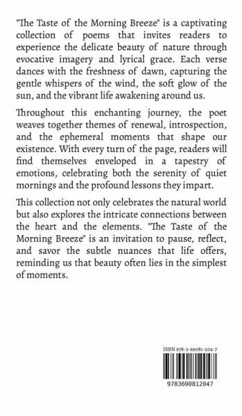 "The Taste of the Morning Breeze" is a captivating collection of poems that invites readers to experience the delicate beauty of nature through evocative imagery and lyrical grace. Each verse dances with the freshness of dawn, capturing the gentle whispers of the wind, the soft glow of the sun, and the vibrant life awakening around us. Throughout this enchanting journey, the poet weaves together themes of renewal, introspection, and the ephemeral moments that shape our existence. With every turn of the page, readers will find themselves enveloped in a tapestry of emotions, celebrating both the serenity of quiet mornings and the profound lessons they impart. This collection not only celebrates the natural world but also explores the intricate connections between the heart and the elements. "The Taste of the Morning Breeze" is an invitation to pause, reflect, and savor the subtle nuances that life offers, reminding us that beauty often lies in the simplest of moments.