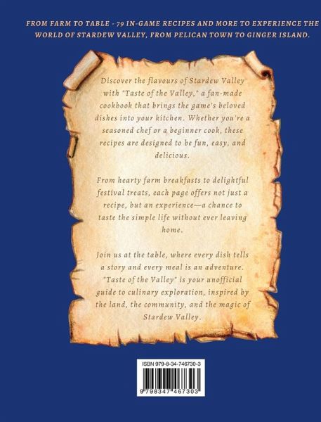 From Farm to Table - 79 in-game recipes and more to take you to the world of Stardew Valley, from Pelican Town to Ginger Island. While tending to your grandfather's farm and getting to know the villagers of Pelican Town, Mayor Lewis surprises you with a cookbook that belonged to your grandmother. Inside, you find a collection of recipes and heartfelt letters from the villagers, inviting you to continue the town's culinary traditions with passion and care. Discover the flavours of Stardew Valley with "Taste of the Valley," a fan-made cookbook that brings the game's beloved dishes into your kitchen. Whether you're a seasoned chef or a beginner cook, these recipes are designed to be fun, easy, and delicious. From hearty farm breakfasts to delightful festival treats, each page offers not just a recipe, but an experience-a chance to taste the simple life without ever leaving home. Disclaimer: Taste of the Valley is a fan-made cookbook and is not officially endorsed by or affiliated with Stardew Valley or its creators. All recipes and content are inspired by the game and its community.