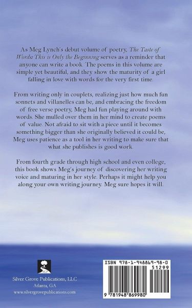 As Meg Lynch's debut volume of poetry, The Taste of Words: This is Only the Beginning serves as a reminder that anyone can write a book. The poems in this volume are simple yet beautiful, and they show the maturity of a girl falling in love with words for the very first time. From writing only in couplets, realizing just how much fun sonnets and villanelles can be, and embracing the freedom of free verse poetry, Meg had fun playing around with words. She mulled over them in her mind to create poems of value. Not afraid to sit with a piece until it becomes something bigger than she originally…mehr