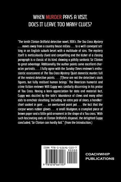"The tenth Clinton Driffield detective novel, 1935's The Tau Cross Mystery . . . moves away from a country house milieu . . . to a well-conveyed setting in an English suburb beset with a multitude of sins. The mystery itself is meticulously clued and compelling and the kicker of a closing paragraph is a classic of its kind, showing a pithily sardonic Sir Clinton to great advantage. Additionally, the author paints some excellent character portraits. . . . I fully agree with the Sunday Times reviewer's enthusiastic assessment of The Tau Cross Mystery: 'Quiet domestic murder, full of the neatest detective points. . . . [T]hese are not the detective's stock figures, but fully realised human beings.' The American humorist and crime fiction reviewer Will Cuppy was similarly discerning in his praise of Tau Cross. Having a keen appreciation for data and material fact, Cuppy was dazzled by the tale's 'abundance of clews and many other aids to armchair sleuthing,' including 'an extra pair of shoes, a handkerchief soaked in gore . . . an overturned paint pot . . . the fact that the corpse wears rubber gloves . . . a small bludgeon, a crumpled piece of brown paper and a little gold ornament in the shape of a Tau cross.' With such fascinating aids at Clinton Driffield's disposal, the delighted Cuppy concluded, 'Sir Clinton can hardly fail.'" (From the Introduction.)