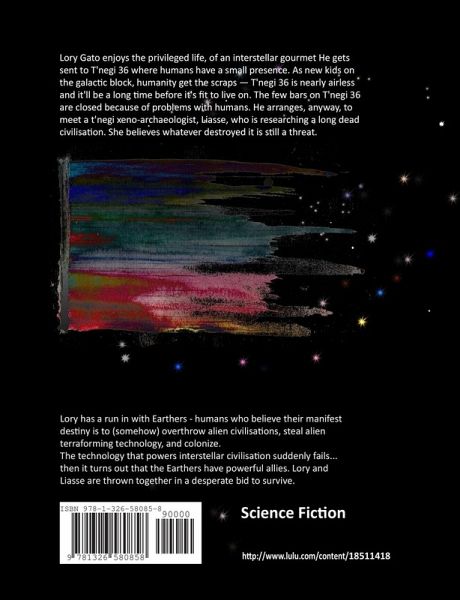 Lory Gato enjoys the privileged life, of an interstellar gourmet He gets sent to T'negi 36 where humans have a small presence. As new kids on the galactic block, humanity get the scraps - T'negi 36 is nearly airless and it'll be a long time before it's fit to live on. The few bars on T'negi 36 are closed because of problems with humans. He arranges, anyway, to meet a t'negi xeno-archaeologist, Liasse, who is researching a long dead civilisation. She believes whatever destroyed it is still a threat. Lory has a run in with Earthers - humans who believe their manifest destiny is to (somehow) overthrow alien civilisations, steal alien terraforming technology, and colonize. The technology that powers interstellar civilisation suddenly fails... then it turns out that the Earthers have powerful allies. Lory and Liasse are thrown together in a desperate bid to survive.