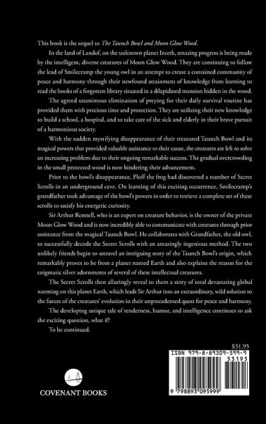 This book is the sequel to The Taunch Bowl and Moon Glow Wood. In the land of Landof, on the unknown planet Interk, amazing progress is being made by the intelligent, diverse creatures of Moon Glow Wood. They are continuing to follow the lead of Smilecramp the young owl in an attempt to create a contained community of peace and harmony through their newfound attainment of knowledge from learning to read the books of a forgotten library situated in a dilapidated mansion hidden in the wood. The agreed unanimous elimination of preying for their daily survival routine has provided them with precious time and protection. They are utilizing their new knowledge to build a school, a hospital, and to take care of the sick and elderly in their brave pursuit of a harmonious society. With the sudden mystifying disappearance of their treasured Taunch Bowl and its magical powers that provided valuable assistance to their cause, the creatures are left to solve an increasing problem due to their ongoing remarkable success. The gradual overcrowding in the small protected wood is now hindering their advancement. Prior to the bowl's disappearance, Ploff the frog had discovered a number of Secret Scrolls in an underground cave. On learning of this exciting occurrence, Smilecramp's grandfather took advantage of the bowl's powers in order to retrieve a complete set of these scrolls to satisfy his energetic curiosity. Sir Arthur Rennell, who is an expert on creature behavior, is the owner of the private Moon Glow Wood and is now incredibly able to communicate with creatures through prior assistance from the magical Taunch Bowl. He collaborates with Grandfather, the old owl, to successfully decode the Secret Scrolls with an amazingly ingenious method. The two unlikely friends begin to unravel an intriguing story of the Taunch Bowl's origin, which remarkably proves to be from a planet named Earth and also explains the reason for the enigmatic silver adornments of several of these intellectual creatures. The Secret Scrolls then alluringly reveal to them a story of total devastating global warming on this planet Earth, which leads Sir Arthur into an extraordinary, wild solution to the future of the creatures' evolution in their unprecedented quest for peace and harmony. The developing unique tale of tenderness, humor, and intelligence continues to ask the exciting question, what if? To be continued.