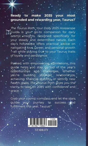 The Taurus Path: Your Daily 2025 Horoscope Guide is your essential companion for navigating the year ahead with confidence, stability, and cosmic insight. Designed specifically for Taurus, this guide provides daily horoscopes and empowering affirmations that align with your grounded, determined nature. Known for your practicality, loyalty, and love for security, this guide taps into those strengths to offer daily guidance on key areas of your life-whether you're pursuing career success, nurturing relationships, or focusing on personal growth. Each horoscope is crafted to help you make the most of each day, offering advice to stay balanced and focused while handling the challenges and opportunities 2025 will bring. In addition to daily horoscopes, The Taurus Path offers affirmations to keep you centered and motivated. These positive messages will help you maintain your focus and stay true to your goals, offering a moment of reflection or encouragement whenever you need it. Perfect for astrology enthusiasts or Taurus individuals seeking practical and insightful guidance, this book is more than just a horoscope guide-it's your personal roadmap for thriving in 2025. Whether you're looking to strengthen relationships, advance your career, or create more balance in your life, The Taurus Path provides the tools you need to stay aligned with the universe and your personal goals. This pocket-sized edition ensures that you have your horoscope and affirmations wherever you go, making it easy to check in with the stars at any time of the day. The convenient format allows you to take daily cosmic wisdom on the go, helping you make informed decisions and embrace each day with confidence. Let The Taurus Path be your guide as you navigate 2025 with determination, resilience, and grace. This is your year to create lasting success and fulfillment-let the stars light your path to personal growth and prosperity!