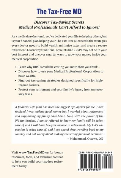 Discover Tax-Saving Secrets Medical Professionals Can't Afford to Ignore! As a medical professional, you've dedicated your life to helping others, but is your financial plan helping you? The Tax-Free MD reveals the strategies every doctor needs to build wealth, minimize taxes, and create a secure retirement. Learn why traditional accounts like RRSPs may not be in your best interest and uncover smarter ways to grow your money inside your medical corporation. * Learn why RRSPs could be costing you more than you think. * Discover how to use your Medical Professional Corporation to build wealth. * Find out tax-saving strategies designed specifically for high-income earners. * Protect your retirement and your family's legacy from unnecessary taxes.