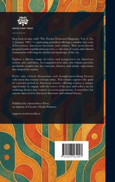 Step back in time with "The Taylor-Trotwood Magazine, Vol. 4, No. 4, January 1907," a captivating periodical offering a window into early 20th-century American literature and culture. This meticulously prepared print republication presents a collection of essays and cultural commentary reflecting the intellectual landscape of the era. Explore a diverse range of voices and perspectives on American society, arts, and ideas. As a snapshot of its time, this volume provides invaluable insights into the concerns, debates, and artistic expressions that shaped the nation. Delve into critical discussions and thought-provoking literary collections that remain relevant today. This volume captures the spirit of a pivotal period in American history, offering readers a unique opportunity to engage with the voices of the past and reflect on the enduring themes that connect us across generations. A must-have for anyone interested in American literature and cultural history. This work has been selected by scholars as being culturally important, and is part of the knowledge base of civilization as we know it. This work is in the public domain in the United States of America, and possibly other nations. Within the United States, you may freely copy and distribute this work, as no entity (individual or corporate) has a copyright on the body of the work. Scholars believe, and we concur, that this work is important enough to be preserved, reproduced, and made generally available to the public. We appreciate your support of the preservation process, and thank you for being an important part of keeping this knowledge alive and relevant.