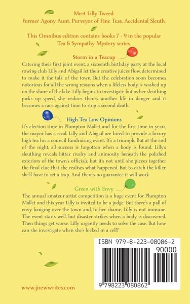 Meet Lilly Tweed. Former Agony Aunt. Purveyor of Fine Teas. Accidental Sleuth. This Omnibus edition contains books 7 - 9 in the popular Tea & Sympathy Mystery series. Storm in a Teacup Catering their first joint event, a sixteenth birthday party at the local rowing club, Lilly and Abigail let their creative juices flow, determined to make it the talk of the town. But the celebration soon becomes notorious for all the wrong reasons when a lifeless body is washed up on the shore of the lake. Lilly begins to investigate but as her sleuthing picks up speed she realises there's another life in danger and it becomes a race against time to stop a second death. High Tea Low Opinions It's election time in Plumpton Mallet and for the first time in years, the mayor has a rival. Lilly and Abigail are hired to provide a luxury high tea for a council fundraising event. It's a triumph. But at the end of the night all success is forgotten when a body is found. Lilly's sleuthing reveals bitter rivalry and animosity beneath the polished exteriors of the town's officials, but it's not until she pieces together the final clue that she realises what happened. But to catch the killer, she'll have to set a trap. And there's no guarantee it will work. Green with Envy The annual amateur artist competition is a huge event for Plumpton Mallet and this year Lilly is invited to be a judge. But there's a pall of envy hanging over the town and, to her shame, Lilly is not immune. The event starts well, but disaster strikes when a body is discovered. Then things get worse. Lilly urgently needs to solve the case. But how can she investigate when she's locked in a cell? This OMNIBUS EDITION contains books 7, 8, and 9 in the exciting Tea & Sympathy mystery series. If you like twists and turns, red herrings galore and big crimes in small British towns, then you'll love J. New's latest series. Full of lively personalities, intelligent characters and excellent tea! Buy the THIRD OMNIBUS EDITION today and see if you can work out whodunit!