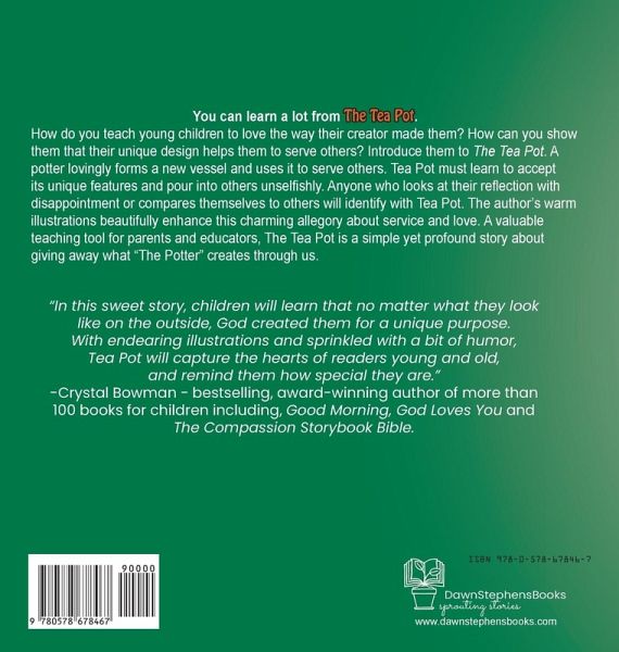 You can learn a lot from The Tea Pot! How do you teach young children to love the way their creator made them? How can you show them that their unique design helps them to serve others? Introduce them to The Tea Pot. A potter lovingly forms a new vessel and uses it to serve others. Tea Pot must learn to accept its unique features and pour into others unselfishly. Anyone who looks at their reflection with disappointment or compares themselves to others will identify with Tea Pot. The author's warm illustrations beautifully enhance this charming allegory about service and love. A valuable…mehr