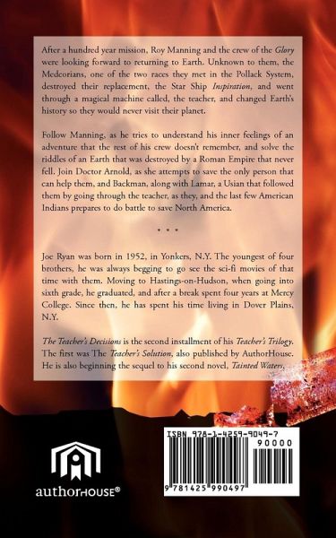 After a hundred year mission, Roy Manning and the crew of the Glory were looking forward to returning to Earth. Unknown to them, the Medcorians, one of the two races they met in the Pollack System, destroyed their replacement, the Star Ship Inspiration, and went through a magical machine called, the teacher, and changed Earth's history so they would never visit their planet. Follow Manning, as he tries to understand his inner feelings of an adventure that the rest of his crew doesn't remember, and solve the riddles of an Earth that was destroyed by a Roman Empire that never fell. Join Doctor Arnold, as she attempts to save the only person that can help them, and Backman, along with Lamar, a Usian that followed them by going through the teacher, as they, and the last few American Indians prepares to do battle to save North America.