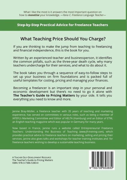 Freelance teachers, who have relied on 'the going rates' only to find out they have continuously undercharged their students and customers, can now work out an acceptable pricing rate for their teaching services to overcome the three-year death cycle causing many freelancers to give up their teaching careers.Teachers see many opportunities for freelance work but is it really possible to make a living as a freelancer in the long-term? Janine Bray-Mueller has encapsulated the key lessons on pricing she learned during her career as a freelance language teacher.Janine explains how to balance your business on three pillars: consultancy (one-to-one teaching), training (seminar workshops) and leverage (information products designed to be sold). This will enable you to build up a sustainable teaching business.In a competitive market, pricing is problematic, particularly in uncertain economic times.Understanding why many teachers are trapped in a position of underearning is the first stepto escape. Your price should never fall below your 'resentment number', the lowest price you will accept without resenting it. Many teachers can be their own worst enemy if they lack self-confidence or undervalue their skills. Familiarity with local market conditions and competitors' prices is important, but the 'going rate' is not necessarily an appropriate rate to charge. You may be under constant pressure to discount prices, and when and how to increase prices to avoid a return to underearning.Value-based pricing is an approach that Janine has applied very successfully to freelance teaching and this is explained fully with valuable practical advice on how it gives a more flexible approach to pricing.Step by step instructions are given on how to identify both your personal and business costs. With the aid of this book, you can calculate your available teaching time and establish your resentment number and price range. Charts and calculation examples are available as MS Excel worksheets on request. Contact links are in the back of the book.Janine presents effective ways to manage pricing matters in an entertaining way that makes them both meaningful and memorable for the freelance teacher. Her book contains all you need to know to overcome your demons, price your teaching services effectively and establish a financially sound career which is sustainable in the long-term.