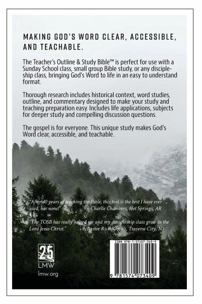 Making God's Word Clear, Accessible, and Teachable. The Teacher's Outline & Study Bible(TM) is perfect for use with a Sunday School class, small group Bible study, or any discipleship class, bringing God's Word to life in an easy to understand format. Thorough research includes historical context, word studies, outline, and commentary designed to make your study and teaching preparation easy. Includes life applications, subjects for deeper study and compelling discussion questions. The gospel is for everyone. This unique study makes God's Word clear, accessible, and teachable. "After 40 years of teaching the Bible, this tool is the best I have ever used, bar none!" - Charlie Chambers, Hot Springs, AR "The TOSB has really helped me and my discipleship class grow in the Lord Jesus Christ." - Pastor Rick Rossilli, Traverse City, MI