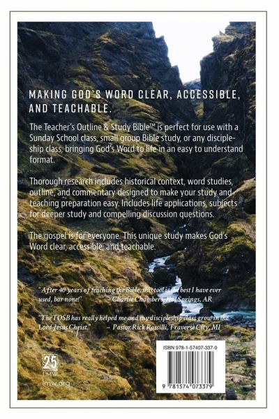 Making God's Word Clear, Accessible, and Teachable. The Teacher's Outline & Study Bible(TM) is perfect for use with a Sunday School class, small group Bible study, or any discipleship class, bringing God's Word to life in an easy to understand format. Thorough research includes historical context, word studies, outline, and commentary designed to make your study and teaching preparation easy. Includes life applications, subjects for deeper study and compelling discussion questions. The gospel is for everyone. This unique study makes God's Word clear, accessible, and teachable. "After 40 years of teaching the Bible, this tool is the best I have ever used, bar none!" - Charlie Chambers, Hot Springs, AR "The TOSB has really helped me and my discipleship class grow in the Lord Jesus Christ." - Pastor Rick Rossilli, Traverse City, MI