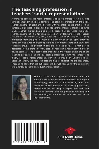 A profissão docente nas representações sociais de professores: um estudo com docentes em início de carreira (The teaching profession in the social representations of teachers: a study with teachers at the start of their careers), a publication organized by researcher Marcella Thaiane de Lima Silva, reaches the reading public as a study that addresses the social representations of the teaching profession of teachers at the Federal University of Pernambuco (UFPE), Brazil. The idea of studying the teaching profession from the point of view of the Theory of Social Representations came about as a result of joining the "Social Representations and Education" research group. The publication consists of three parts. The first part is dedicated to the state of knowledge of research already carried out on novice teachers. The second part presents a theoretical treatment of the teaching profession, as well as dealing theoretically with the concept and theory of social representations, with an emphasis on Doise's societal approach. Finally, the research data and final considerations are presented. There is no doubt that the publication will be well received by the community of students, teachers and educational researchers.