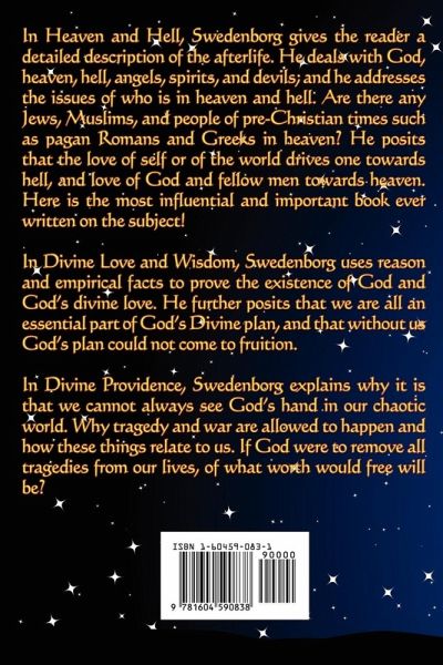 In Heaven and Hell, Swedenborg gives the reader a detailed description of the afterlife. He deals with God, heaven, hell, angels, spirits, and devils; and he addresses the issues of who is in heaven and hell. Are there any Jews, Muslims, and people of pre-Christian times such as pagan Romans and Greeks in heaven? He posits that the love of self or of the world drives one towards hell, and love of God and fellow men towards heaven. Here is the most influential and important book ever written on the subject! In Divine Love and Wisdom, Swedenborg uses reason and empirical facts to prove the existence of God and God's divine love. He further posits that we are all an essential part of God's Divine plan, and that without us God's plan could not come to fruition. In Divine Providence, Swedenborg explains why it is that we cannot always see God's hand in our chaotic world. Why tragedy and war are allowed to happen and how these things relate to us. If God were to remove all tragedies from our lives, of what worth would free will be?