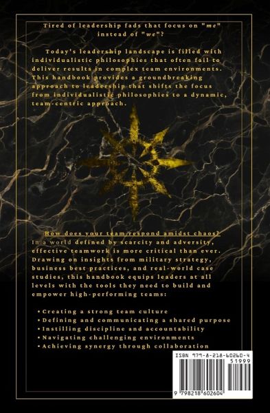 Tired of leadership fads that focus on "me" instead of "we"? Today's leadership landscape is filled with individualistic philosophies that often fail to deliver results in complex team environments. The Team Leadership Handbook offers a refreshing alternative: a practical, results-driven, team-centric approach to optimizing performance in today's demanding world. In a world defined by scarcity and adversity, effective teamwork is more critical than ever. This handbook provides a groundbreaking approach to leadership that shifts the focus to a dynamic, team-oriented model. Drawing on insights from military strategy, business best practices, and real-world case studies, The Team Leadership Handbook equips leaders at all levels with the tools they need to:Create a strong team culture Define and communicate a shared purpose Instill discipline and accountability Navigate challenging environments Achieve synergy through collaboration Discover how to create a culture of synergy, navigate scarcity and adversity, and achieve extraordinary results through the power of teamwork. The Team Leadership Handbook is your guide to building and empowering high-performing teams.