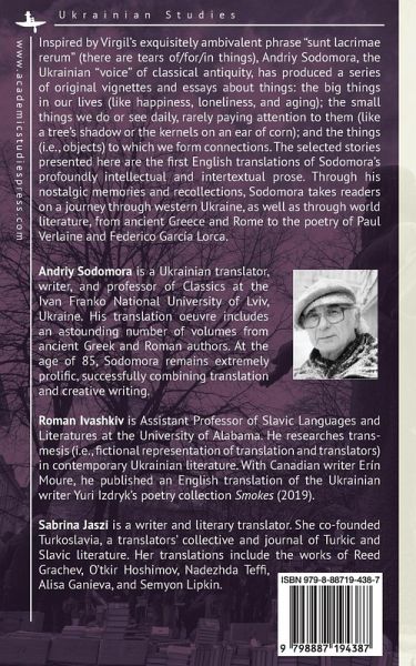 An evocative collection of vignettes and essays from Ukraine's "voice" of classical antiquity, now available in English for the first time. Inspired by Virgil’s exquisitely ambivalent phrase “sunt lacrimae rerum” (there are tears of/for/in things), Andriy Sodomora, the Ukrainian “voice” of classical antiquity, has produced a series of original vignettes and essays about things: the big things in our lives (like happiness, loneliness, and aging); the small things we do or see daily, rarely paying attention to them (like a tree’s shadow or the kernels on an ear of corn); and the things (i.e., objects) to which we form connections. The selected stories presented here are the first English translations of Sodomora’s profoundly intellectual and intertextual prose. Through his nostalgic memories and recollections, Sodomora takes readers on a journey through western Ukraine, as well as through world literature, from ancient Greece and Rome to the poetry of Paul Verlaine and Federico Garcíiacute;a Lorca. This book has been published with the support of the Translate Ukraine Translation Program.
