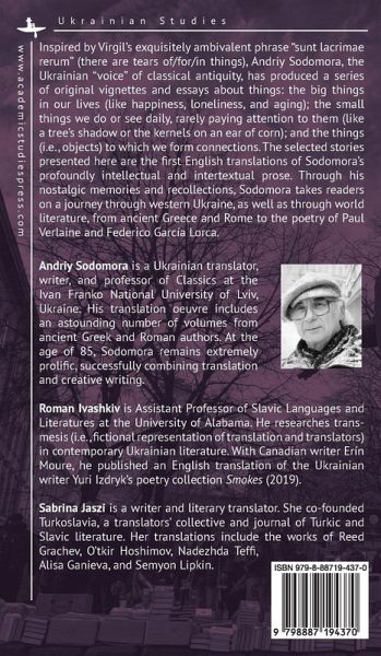 An evocative collection of vignettes and essays from Ukraine's ?voice? of classical antiquity, now available in English for the first time. Inspired by Virgil's exquisitely ambivalent phrase ?sunt lacrimae rerum? (there are tears of/for/in things), Andriy Sodomora, the Ukrainian ?voice? of classical antiquity, has produced a series of original vignettes and essays about things: the big things in our lives (like happiness, loneliness, and aging); the small things we do or see daily, rarely paying attention to them (like a tree's shadow or the kernels on an ear of corn); and the things (i.e., objects) to which we form connections. The selected stories presented here are the first English translations of Sodomora's profoundly intellectual and intertextual prose. Through his nostalgic memories and recollections, Sodomora takes readers on a journey through western Ukraine, as well as through world literature, from ancient Greece and Rome to the poetry of Paul Verlaine and Federico García Lorca. This book has been published with the support of the Translate Ukraine Translation Program.