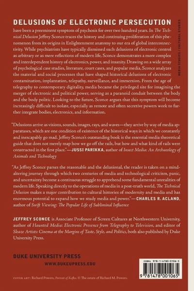 Delusions of electronic persecution have been a preeminent symptom of psychosis for over two hundred years. In The Technical Delusion Jeffrey Sconce traces the history and continuing proliferation of this phenomenon from its origins in Enlightenment anatomy to our era of global interconnectivity. While psychiatrists have typically dismissed such delusions of electronic control as arbitrary or as mere reflections of modern life, Sconce demonstrates a more complex and interdependent history of electronics, power, and insanity. Drawing on a wide array of psychological case studies, literature, court cases, and popular media, Sconce analyzes the material and social processes that have shaped historical delusions of electronic contamination, implantation, telepathy, surveillance, and immersion. From the age of telegraphy to contemporary digitality, the media emerged within such delusions to become the privileged site for imagining the merger of electronic and political power, serving as a paranoid conduit between the body and the body politic. Looking to the future, Sconce argues that this symptom will become increasingly difficult to isolate, especially as remote and often secretive powers work to further integrate bodies, electronics, and information.