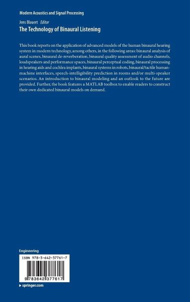 This book reports on the application of advanced models of the human binaural hearing system in modern technology, among others, in the following areas: binaural analysis of aural scenes, binaural de-reverberation, binaural quality assessment of audio channels, loudspeakers and performance spaces, binaural perceptual coding, binaural processing in hearing aids and cochlea implants, binaural systems in robots, binaural/tactile human-machine interfaces, speech-intelligibility prediction in rooms and/or multi-speaker scenarios. An introduction to binaural modeling and an outlook to the future are provided. Further, the book features a MATLAB toolbox to enable readers to construct their own dedicated binaural models on demand.