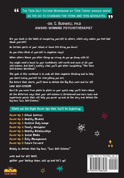 Or are you stuck in the habit of comparing yourself to others, which only makes you feel bad about yourself? Do certain parts of your school or home life bring you down? Do you often think of yourself in negative ways? When others blame you after things go wrong, do you go along with it? You might need a boost to your confidence, self-worth, and, most of all, your self-esteem. And that's exactly what you'll get after completing "The Teen Self-Esteem Workbook" The goal of this workbook is to undo all that thinking and to help you start loving yourself for everything you are. That's what self-esteem is all about, loving yourself for who you are! You'll go on a heroic quest of self-discovery, unlocking 8 Power-Ups until you've reached the final destination: Confidence and Higher Self-Esteem. As you move from place to place on your quest map, you'll learn about all the different ways that your self-esteem is threatened and be given tools and experience points that will help you power up and, at the very end, defeat the big boss, 'Low Self-Esteem.' Check out the Eight Power Ups that You'll be Exploring: Power-Up 1: School Success: Learn how to navigate the pressures related to school and be in tune with how they make you feel. Learn how to deal with stressful encounters with teachers and other students so your self-esteem is not impacted. Power-Up 2: Healthy Mindset Learn what to do when you feel hurt, jealous, anxious, or when self-doubt comes creeping in. Learn how to develop a self-care plan that will stick, and that is perfect for you. Know when you need extra help from a trusted adult. Power-Up 3: Positive Body Image Learn about your opponent: low body image, and get tips for how to defeat it. Get your backup team ready for extra support, and then suit up! We'll give you practical tips for developing a positive body image and keeping it that way. Power-Up 4: Family Navigator Learn how your family relationships can have a huge impact on your self-esteem. And learn how to navigate tough topics and express yourself fully. Power-Up 5: Healthy Relationships Discover what you can do to have healthier relationships with others by setting boundaries, handling pressure, having the courage to be your authentic self, and more! Power-Up 6: Social Media When it comes to social media, you'll need to wear a suit of armor to properly protect your confidence, self-worth, and the way you think of yourself. Power-Up 7: Bully Management Bullying is on the rise. As such, you'll need the proper tools to evade their harmful blows on your self-esteem. Learn how to advocate for yourself, pump yourself up with positive self-talk, and return harsh words for kindness. Power-Up 8: Future Forward You've got a bright future ahead of you, especially after you've gained all the tools to defeat the big boss, Low Self-Esteem. Make solid plans and learn how to be comfortable with the unknown. Ready to defeat that big boss "Low Self Esteem" once and for all? Well, gather your backup team, suit up, and let's go! Pick up your copy today to start this ultimate quest!