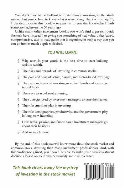 You don't have to be brilliant to make money investing in the stock market, but you do have to know what you are doing. That's why, at age 75, I decided to write this book -- to pass on to you the knowledge I wish someone had given me 60 years ago. This book is not one of those get-rich-quick books that populates the bookshelves, but rather something of real value -- a fact-based, comprehensive, easy-to-read guide about commons stocks, the stock market, and alternative investment strategies that is organized in such a way that you can go into as much depth as desired. With the mystery cleared away and, with the knowledge gained, you should be able to make your own investment decisions, based on your own personality and risk-tolerance. You will learn why now, in your youth, is the best time to start building serious wealth; The risks and rewards of investing in common stocks; The pros and cons of active, passive, and factor-based investing; The pros and cons of investing in mutual funds and exchange traded funds; The ways to avoid market timing; The strategies used by investment managers to time the market; The role emotions play in investing; The role demographics, productivity, and the government play in long-term investing; How active, passive, and factor-based investment managers go about their business; and so much more. It's all here and it's a must read for teenagers, young adults, and anyone else who wants to invest in common stocks.