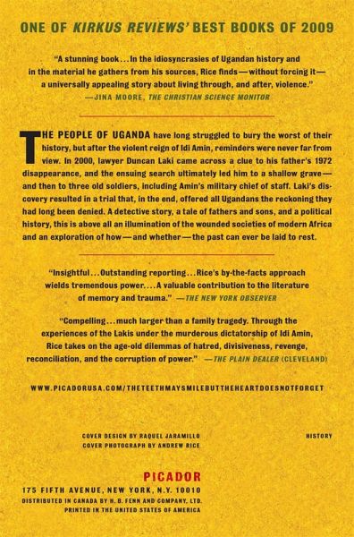 From a new star of American journalism, a riveting murder mystery that reveals the forces roiling today's Africa From Rwanda to Sierra Leone, African countries recovering from tyranny and war are facing an impossible dilemma: to overlook past atrocities for the sake of peace or to seek catharsis through tribunals and truth commissions. Uganda chose the path of forgetting: after Idi Amin's reign was overthrown, the new government opted for amnesty for his henchmen rather than prolonged conflict. Ugandans tried to bury their history, but reminders of the truth were never far from view. A stray clue to the 1972 disappearance of Eliphaz Laki led his son to a shallow grave-and then to three executioners, among them Amin's chief of staff. Laki's discovery resulted in a trial that gave voice to a nation's past: as lawyers argued, tribes clashed, and Laki pressed for justice, the trial offered Ugandans a promise of the reckoning they had been so long denied. For four years, Andrew Rice followed the trial, crossing Uganda to investigate Amin's legacy and the limits of reconciliation. At once a mystery, a historical accounting, and a portrait of modern Africa, The Teeth May Smile But the Heart Does Not Forget is above all an exploration of how -- and whether -- the past can be laid to rest. One of Kirkus Reviews' Best Books of 2009