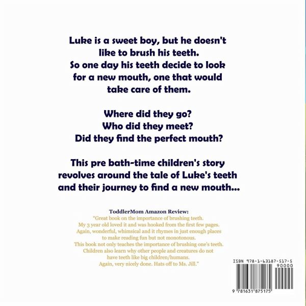 Luke is a sweet boy, but he doesn't like to brush his teeth. So one day his teeth decide to look for a new mouth, one that would take care of them. Where did they go? Who did they meet? Did they find the perfect mouth? This pre bath-time children's story revolves around the tale of Luke's teeth and their journey to find a new mouth... Get a free GIFT inside "10 Fun ways to engage your children to brush their teeth" Pick up your copy today!