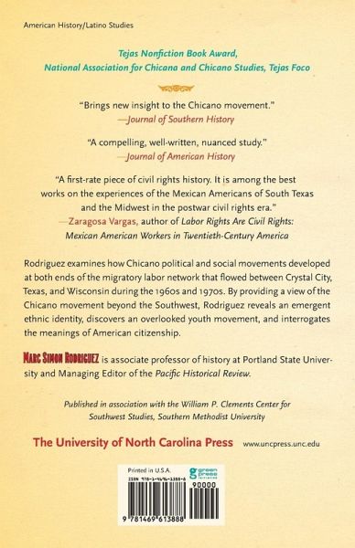 Each spring during the 1960s and 1970s, a quarter million farm workers left Texas to travel across the nation, from the Midwest to California, to harvest America’s agricultural products. During this migration of people, labor, and ideas, Tejanos established settlements in nearly all the places they traveled to for work, influencing concepts of Mexican Americanism in Texas, California, Wisconsin, Michigan, and elsewhere. In The Tejano Diaspora, Marc Simon Rodriguez examines how Chicano political and social movements developed at both ends of the migratory labor network that flowed between Crystal City, Texas, and Wisconsin during this period. Rodriguez argues that translocal Mexican American activism gained ground as young people, activists, and politicians united across the migrant stream. Crystal City, well known as a flash point of 1960s-era Mexican Americanism, was a classic migrant sending community, with over 80 percent of the population migrating each year in pursuit of farm work. Wisconsin, which had a long tradition of progressive labor politics, provided a testing ground for activism and ideas for young movement leaders. By providing a view of the Chicano movement beyond the Southwest, Rodriguez reveals an emergent ethnic identity, discovers an overlooked youth movement, and interrogates the meanings of American citizenship.