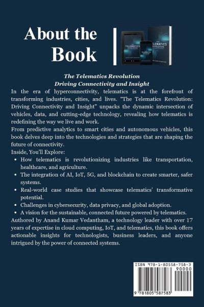 In the era of hyperconnectivity, telematics is at the forefront of transforming industries, cities, and lives. "The Telematics Revolution: Driving Connectivity and Insight" unpacks the dynamic intersection of vehicles, data, and cutting-edge technology, revealing how telematics is redefining the way we live and work. From predictive analytics to smart cities and autonomous vehicles, this book delves deep into the technologies and strategies that are shaping the future of connectivity. Inside, You'll Explore: ¿ How telematics is revolutionizing industries like transportation, healthcare, and agriculture. ¿ The integration of AI, IoT, 5G, and blockchain to create smarter, safer systems. ¿ Real-world case studies that showcase telematics' transformative potential. ¿ Challenges in cybersecurity, data privacy, and global adoption. ¿ A vision for the sustainable, connected future powered by telematics. Authored by Anand Kumar Vedantham, a technology leader with over 17 years of expertise in cloud computing, IoT, and telematics, this book offers actionable insights for technologists, business leaders, and anyone intrigued by the power of connected systems. Your Roadmap to the Future Embark on a journey into the heart of telematics innovation and discover the limitless possibilities of connectivity and insight.