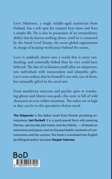 Leevi Mielonen, a single middle-aged statistician from Finland, has a soft spot for caramel bear claws and lives a simple life. He is also in possession of an extraordinary ability that he knows nothing about, until he is contacted by the Astral Level Troops, the secret global organization in charge of keeping world peace behind the scenes.Leevi is suddenly drawn into a world that is more vast, dazzling, and cosmically linked than he ever could have believed. The fate of civilization itself relies on teleporters, rare individuals with transcendent and telepathic gifts. Leevi soon realizes that he himself is not only one of them, but unusually gifted in the astral arts.From murderous autocrats and psychic spies to wandering ghosts and Mayan rain-gods, this story is full of wild characters in even wilder situations . The stakes are as high as they can be in this speculative fiction novel.The Teleporter is the debut novel from Finnish plumbing entrepreneur Jari Enckell. It is a quick-paced farce with pressing themes, spectacular plot twists, and dry hilarity - all based on real events and places, and on the psychedelic mysteries of consciousness and the cosmos. The book is translated into English by bilingual author and poet Kasper Salonen.