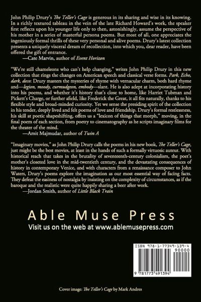 Through their cinematic storytelling, the poems in John Philip Drury's The Teller's Cage swell the heart and the imagination. The book opens with baseball and culminates with persona poems starring the poet's mother, along the way unraveling factual and fantastical chronicles in enchanting locales. Drury's formal prowess is on display throughout this versified blockbuster. PRAISE FOR THE TELLER'S CAGE: In John Philip Drury's The Teller's Cage, in a richly textured tableau in the vein of the late Richard Howard's work, the speaker first reflects upon his younger life only to then, astonishingly, assume the perspective of his mother in a series of masterful persona poems. But most of all, one appreciates the ingeniously formal thrills of these very personal and alive poems. Drury's latest collection presents a uniquely visceral dream of recollection, into which you, dear reader, have been offered the gift of entrance. -Cate Marvin, author of Event Horizon "We're still chameleons who can't help changing," writes John Philip Drury in this new collection that rings the changes on American speech and classical verse forms. Park, Echo, dark, deco: Drury masters the mysteries of rhyme with vernacular charm, both hard rhyme and-legion, moody, curmudgeon, embody-slant. He is also adept at incorporating history into his poems-close to home and further afield. It all fits naturally, thanks to his flexible style and broad-minded curiosity. Yet we sense the presiding spirit of the collection in his tender, deeply lived and felt poems of love and friendship. Drury's formal restlessness, his skill at poetic shapeshifting, offers us a "lexicon of things that morph," moving, in the final poem of each section, from poetry to cinematography as he scripts imaginary films for the theater of the mind. -Amit Majmudar, author of Twin A "Imaginary movies," as John Philip Drury calls the poems in The Teller's Cage, just might be the best movies, at least in the hands of such a formally virtuosic auteur. With historical reach that takes in the brutality of seventeenth-century colonialism, the poet's mother's closeted love in the mid-twentieth century, and the devastating consequences of history in contemporary Venice, and with characters from a renaissance composer to John Waters, Drury's poems explore the imagination as our most essential way of facing facts. They defeat the easiness of nostalgia by insisting on the complexity of circumstances, as if the baroque and the realistic were quite happily sharing a beer after work. -Jordan Smith, author of Little Black Train ABOUT THE AUTHOR: John Philip Drury is the author of four previous books of poetry: The Disappearing Town, Burning the Aspern Papers, The Refugee Camp, and Sea Level Rising-from Able Muse Press. He has also written Creating Poetry and The Poetry Dictionary, both from Writer's Digest Books. His awards include an Ingram Merrill Foundation fellowship, two Ohio Arts Council grants, and the Bernard F. Conners Prize from The Paris Review. He was born in Cambridge, Maryland, and grew up in Bethesda. He earned degrees from Stony Brook University, the Writing Seminars at Johns Hopkins, and the Iowa Writers' Workshop. After teaching at the University of Cincinnati for thirty-seven years, he is now an emeritus professor and lives with his wife, fellow poet LaWanda Walters, in a hundred-year-old house on the edge of a wooded ravine.
