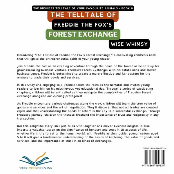 Introducing "The Telltale of Freddie the Fox's Forest Exchange," a captivating children's book that will ignite the entrepreneurial spirit in your young reader! Join Freddie the Fox on an exciting adventure through the heart of the forest as he sets up his groundbreaking business venture, Freddie's Forest Exchange. With his astute mind and clever business sense, Freddie is determined to create a more effective and fair system for the animals to trade their goods and services. In this witty and engaging tale, Freddie takes the reins as the narrator and invites young readers to join him on his mischievous yet educational day. Through a series of captivating chapters, children will be enthralled as they navigate the complexities of Freddie's forest exchange alongside our cunning protagonist. As Freddie encounters various challenges along the way, children will learn the true value of goods and services and the art of negotiation. They'll discover that not all trades are created equal and that understanding the needs of others is the key to a successful exchange. Through Freddie's journey, children will witness firsthand the importance of trust and reciprocity in any transaction. But this delightful story isn't just filled with laughter and clever business insights. It also imparts a valuable lesson on the significance of honesty and trust in all aspects of life, whether it's in the forest or the human world. With Freddie as their guide, young readers aged 5 to 8 will gain a fundamental understanding of the basics of bartering, the value of goods and services, and the importance of trust in all kinds of exchanges. "The Telltale of Freddie the Fox's Forest Exchange" is more than just a children's book; it's a journey of discovery and an opportunity for your child to embrace their entrepreneurial spirit. Inspire their curiosity and ignite their passion for business with Freddie's adventures today!