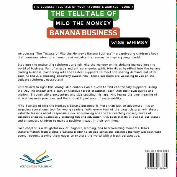 Introducing "The Telltale of Milo the Monkey's Banana Business" - a captivating children's book that combines adventure, humor, and valuable life lessons to inspire young minds! Step into the enchanting rainforest and join Milo the Monkey on his thrilling journey into the world of business. Full of energy and entrepreneurial spirit, Milo dives headfirst into the banana trading business, partnering with the fastest suppliers to meet the soaring demand. But little does he know, a shocking discovery awaits him - these suppliers are wreaking havoc on the delicate rainforest ecosystem! Determined to right this wrong, Milo embarks on a quest to find eco-friendly suppliers. Along the way, he encounters a cast of hilarious forest creatures, each with their own quirks and wisdom. Through witty encounters and side-splitting mishaps, Milo learns the true meaning of ethical business practices and the critical importance of sustainability. "The Telltale of Milo the Monkey's Banana Business" is more than just an adventure - it's an engaging educational tool for young readers. With every turn of the page, children will absorb valuable lessons about responsible decision-making and the far-reaching consequences of business choices. Seamlessly blending fun and education, this book instills a love for our planet and empowers children to make a positive impact in their own lives. Each chapter is a delightful mix of laughter, learning, and heartwarming moments. Milo's transformation from a simple banana trader to an eco-conscious business monkey will captivate young readers, leaving them eager to explore the world with a fresh perspective. With its vibrant illustrations and engaging storytelling, "The Telltale of Milo the Monkey's Banana Business" is a must-have addition to any child's bookshelf. This enchanting tale will not only entertain, but also inspire children to become thoughtful, responsible, and environmentally conscious individuals. Don't miss out on this extraordinary journey that will leave children eagerly turning the pages and begging for more. Join Milo on his epic adventure today and nurture a generation of young minds who are ready to change the world, one responsible choice at a time!