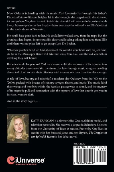 New Orleans is bustling with his music. Carl Lorenzio has brought his father's Dixieland hits to different heights. It's in the streets, in the magazines, in the airwaves, it's everywhere. Yet, there is a void inside him doubtful will ever again be satiated with love, a human quality he has lived without ever since he offered it to Ellie Ypsilanti in the sunlit shores of Santorini. He could have gone back to her, could have walked away from the traps. But the drumbeat had begun. It came steadily closer and louder, pushing him away from Ellie until there was no place left to go except Lois De Becher. Whatever gratifies him, Carl finds it onboard the colorful steamboats with his jazz band. As far as the Mississippi River will take him away from Lois and the old antebellum dwelling they call 'home.' But miracles do happen, and Carl has a reason to lift the resonance of his trumpet into merry altitudes once more. Yet, the sirens that lure through magic song are crawling closer and closer to bear their offerings with even more chaos than four decades ago. A tale of love, beauty, and mischief, a modern-day Odyssey from the 60s' to the 2000s', packed with images of scenery, voyages, flavors, and music. The music kind that twangs and trembles within the Aeolian passageways as sound, and the mystery of its magnetic pull and connection with the mystery of love that once it gets you in its clasp...you are aloft. And so the story begins . . .