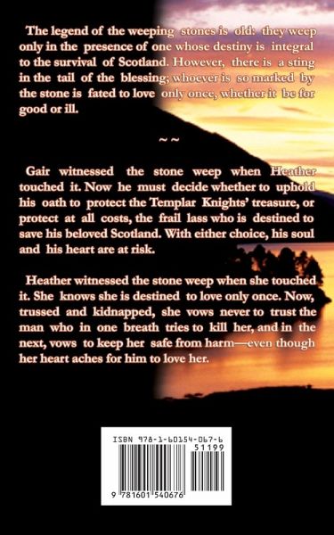 The legend of the weeping stones is old: they weep only in the presence of one whose destiny is integral to the survival of Scotland. However, there is a sting in the tail of the blessing; whoever is so marked by the stone is fated to love only once, whether it be for good or ill. ~ ~ Gair witnessed the stone weep when Heather touched it. Now he must decide whether to uphold his oath to protect the Templar Knights--treasure, or protect at all costs, the frail lass who is destined to save his beloved Scotland. With either choice, his soul and his heart are at risk. Heather witnessed the stone weep when she touched it. She knows she is destined to love only once. Now, trussed and kidnapped, she vows never to trust the man who in one breath tries to kill her, and in the next, vows to keep her safe from harm--even though her heart aches for him to love her.