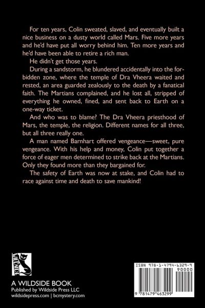 For ten years, Colin sweated, slaved, and eventually built a nice business on a dusty world called Mars. Five more years and he'd have put all worry behind him. Ten more years and he'd have been able to retire a rich man. He didn't get those years. During a sandstorm, he blundered accidentally into the forbidden zone, where the temple of Dra Vheera waited and rested, an area guarded zealously to the death by a fanatical faith. The Martians complained, and he lost all, stripped of everything he owned, fined, and sent back to Earth on a one-way ticket. And who was to blame? The Dra Vheera priesthood of Mars, the temple, the religion. Different names for all three, but all three really one. A man named Barnhart offered vengeance-sweet, pure vengeance. With his help and money, Colin put together a force of eager men determined to strike back at the Martians. Only they found more than they bargained for. The safety of Earth was now at stake, and Colin had to race against time and death to save mankind!