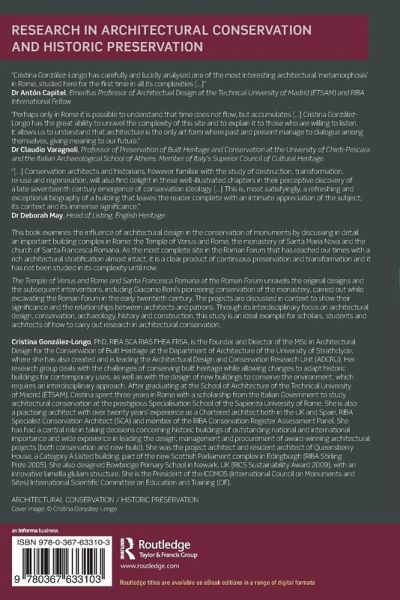 González-Longo provides here a riveting account of the complex evolution of the great Olivetan monastery and basilica, Santa Francesca Romana, leading us for the first time through its integral relationship with the Temple of Venus and Roma, adeptly drawing throughout on primary and contemporary sources, literature and imagery and showing insightful command of the rich instruction they unravel. The author's research revealed phases and aspects of the many engagements with the site unknown until now and which ensure the assessment brings new depth to our understanding of this monumental edifice. Conservation architects and historians, however familiar with the study of destruction, transformation, re-use and regeneration, will also find delight in these well-illustrated chapters in their perceptive discovery of a late seventeenth century emergence of conservation ideology. The monograph traces the development of the conservation discipline following Carlo Lambardi's transformation of the medieval church, through respective ideologies in their application, showing lineage with the later thinking of Ruskin and SPAB, the influential, ground-breaking approach of Giacomo Boni in the early twentieth century and on to stratigraphic architectural conservation or design and the informed conservation we prize today. This is, most satisfyingly, a refreshing and exceptional biography of a building that leaves the reader complete with an intimate appreciation of the subject, its context and its immense significance.