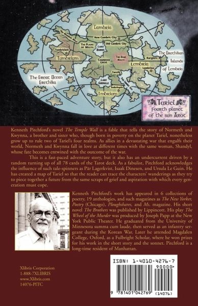 Kenneth Pitchford's novel The Temple Wall is a fable that tells the story of Normeth and Kwynna, a brother and sister who, though born in poverty on the planet Tariel, nonetheless grow up to rule two of Tariel's four realms. As allies in a devastating war that engulfs their world, Normeth and Kwynna fall in love at different times with the same woman, Shandyl, whose fate becomes entwined with the outcome of the war. This is a fast-paced adventure story, but it also has an undercurrent driven by a random turning up of all 78 cards of the Tarot deck. As a fabulist, Pitchford acknowledges the influence of such tale-spinners as Pär Lagerkvist, Isaak Dinesen, and Ursula Le Guin. He has created a map of Tariel so that the reader can trace the characters' wanderings as they try to piece together a future from the same scraps of grief and aspiration with which every generation must cope.