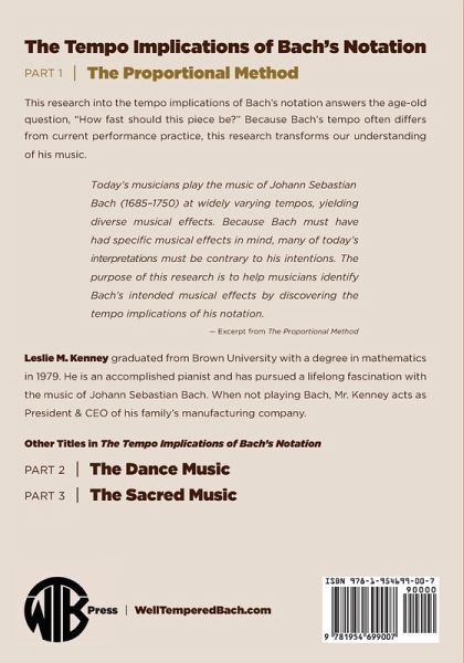 This research into the tempo implications of Bach's notation answers the age-old question of Bach's tempos, providing insight into Bach's intended musical effects. Johann Sebastian Bach (1685-1750) was a very busy man. At times he composed a new church piece every week, often barely completing the piece a day or two before the church service. In order to ensure that his music lasted the appropriate amount of time, he needed to calculate duration while composing. To do so he needed to have specific tempos in mind. A review of the contemporaneous performance practice literature indicates that, in this time period before the development of the metronome: · Establishing the correct tempo was considered an important and difficult task. · Musicians used a fixed pulse rate called the tactus to establish tempos. · Once they established a tempo, they were able to vary that tempo by using proportions. · The time signature and the shortest note value of a piece both communicate information about tempo. Through a comprehensive review of Bach's notation, this research demonstrates that there is one optimal way to explain the tempo implications of Bach's notation. It further shows that Bach used two different tactus speeds, and indicated a change in the speed of the tactus by using "mensural" time signatures, which are derived from the ancient music system of the same name. After reading this book, the musician will be able to determine Bach's intended tempo for any Bach movement by identifying the time signature, tactus speed, and shortest note value. Bach's intended tempo gives valuable clues about his intended musical effect. Because Bach's tempo often differs from current performance practice, this research transforms our understanding of his music. This book is for classical musicians, musicologists, music students, and anyone who appreciates Bach's music. While the research is important and significant, it is presented so that an amateur musician will be able to follow the arguments.