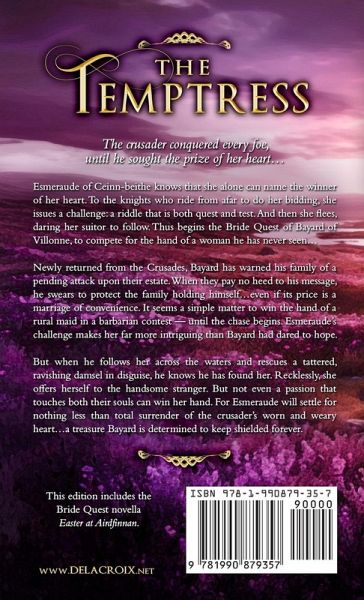 Esmeraude of Ceinn-beithe knows that she alone can name the winner of her heart. To the knights gallant who ride from afar to do her bidding, she issues a challenge: a riddle that is both quest and test. And then she flees, daring her suitor to follow. Thus begins the Bride Quest of Bayard of Villonne, to compete for the hand of a woman he has never seen...Newly returned from the Crusades, Bayard has warned his family of a pending attack upon their estate. When they pay no heed to his message, he swears to protect the family holding himself...even if its price is a marriage of convenience. It seems a simple matter to win the hand of a rural maid in a barbarian contest-until the chase begins. Esmeraude's challenge makes her far more intriguing than Bayard had dared to hope. But when he follows her across the waters and rescues a tattered, ravishing damsel in disguise, he knows he has found her. Recklessly, she offers herself to the handsome stranger. But not even a passion that touches both their souls can win her hand. For Esmeraude will settle for nothing less than total surrender of the crusader's worn and weary heart...a treasure Bayard is determined to keep shielded forever. "A magical tale...brims with rich, historical detail, entertaining banter and romantic tension!"-Publishers Weekly Celebrate 25 years since the original publication of The Princess with this commemorative edition, including a new letter from Claire. This edition of The Temptress also includes the new Bride Quest novella, Easter at Airdfinnan.