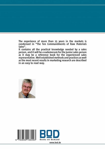 The experience of more than 25 years in the markets is condensed in "TheTen Commandments of Raw Materials Sales" It contains all the practical knowledge needed by a sales person, and it will be a vademecum for the junior sales person as it may be a reference book for the experienced sales representative. Well established methods and practices as well as the most recent results in marketing research are described in an easy to read way.