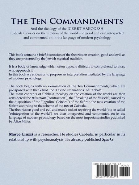 This book contains a brief discussion of the theories on creation, good and evil, as they are presented by the Jewish mystical tradition. It is a body of knowledge which often appears difficult to comprehend to those who approach it. In this book we endeavor to propose an interpretation mediated by the language of modern psychology. The book begins with an examination of the Ten Commandments, which are juxtaposed with the Sefirot, the ""Divine Emanations"" of Cabbala. The main concepts of Cabbala theology on the creation of the world are then considered: the tzimtzum (""contraction""), the ""Breaking of the Vessels"", caused by the disposition of the ""Iggulim"" (""circles"") of the Sefirot, the new creation of the Sefirot according to the scheme of the tree of Cabbala. The theories on good and evil and man's task of repairing the world (the so called ""reintegration of the world"") are then interpreted and commented on in the language of modern psychology, based on the most important studies published by Alice Miller.