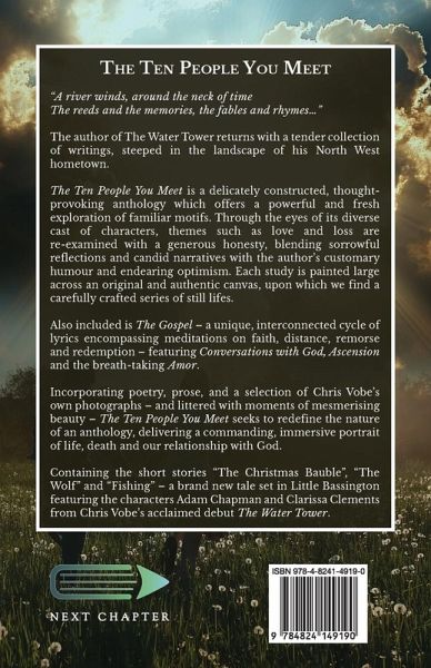 "A river winds, around the neck of time The reeds and the memories, the fables and rhymes..." The author of The Water Tower returns with a tender collection of writings, steeped in the landscape of his North West hometown. The Ten People You Meet is a delicately constructed, thought-provoking anthology which offers a powerful and fresh exploration of familiar motifs. Through the eyes of its diverse cast of characters, themes such as love and loss are re-examined with a generous honesty, blending sorrowful reflections and candid narratives with the author's customary humour and endearing optimism. Each study is painted large across an original and authentic canvas, upon which we find a carefully crafted series of still lifes. Also included is The Gospel - a unique, interconnected cycle of lyrics encompassing meditations on faith, distance, remorse and redemption - featuring Conversations with God, Ascension and the breath-taking Amor. Incorporating poetry, prose, and a selection of Chris Vobe's own photographs - and littered with moments of mesmerising beauty - The Ten People You Meet seeks to redefine the nature of an anthology, delivering a commanding, immersive portrait of life, death and our relationship with God. Containing the short stories "The Christmas Bauble", "The Wolf" and "Fishing" - a brand new tale set in Little Bassington featuring the characters Adam Chapman and Clarissa Clements from Chris Vobe's acclaimed debut The Water Tower.