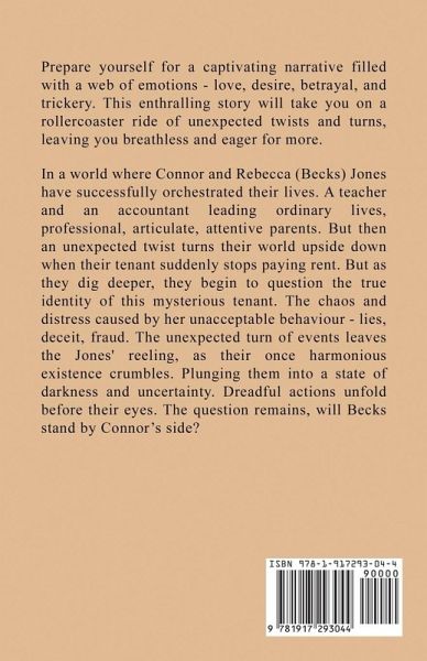 Prepare yourself for a captivating narrative filled with a web of emotions - love, desire, betrayal, and trickery. This enthralling story will take you on a rollercoaster ride of unexpected twists and turns, leaving you breathless and eager for more. In a world where Connor and Rebecca (Becks) Jones have successfully orchestrated their lives. A teacher and an accountant leading ordinary lives, professional, articulate, attentive parents. But then an unexpected twist turns their world upside down when their tenant suddenly stops paying rent. But as they dig deeper, they begin to question the true identity of this mysterious tenant. The chaos and distress caused by her unacceptable behaviour - lies, deceit, fraud. The unexpected turn of events leaves the Jones' reeling, as their once harmonious existence crumbles. Plunging them into a state of darkness and uncertainty. Dreadful actions unfold before their eyes. The question remains, will Becks stand by Connor's side?