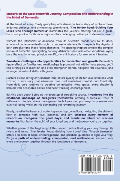 Embark on the Most Heartfelt Journey: Compassion and Understanding in the Midst of Dementia At the heart of every family grappling with dementia lies a story of profound love, enduring patience, and unwavering commitment. "The Tender Road: Guiding Your Loved One Through Dementia" illuminates this journey, offering not just a guide, but a companion for those navigating the challenging pathways of dementia care. Witness the intricacies of dementia-from its scientific foundations to its deep, emotional undercurrents-through a compassionate lens that respects the dignity of both caregiver and those facing dementia. The opening chapters unravel the complex nature of dementia, spotlighting not only Alzheimer's but also other variations, laying bare the emotional and physical ramifications it harbors for everyone it touches. Transform challenges into opportunities for connection and growth. Dementia's ripple effect on families and relationships is profound, yet within these pages, you'll find strategies to maintain and even strengthen bonds, navigate role reversals, and manage behavioral shifts with grace. Nurture a safe, loving environment that fosters quality of life for your loved one while crafting a sanctuary that minimizes risks and maximizes comfort and familiarity. From daily care routines to creating an adaptive living space, every chapter is imbued with actionable advice and heartwarming encouragement. But this book doesn't stop at the doorstep of caregiving tactics. It ventures into the emotional landscape of caregivers themselves, offering a treasure trove of self-care strategies, stress management techniques, and pathways to preserve your own well-being while on this demanding yet rewarding journey. Finally, revel in the beauty of nurturing enduring connections, navigating the ebb and flow of dementia with love, patience, and joy. Embrace every moment of celebration, recognize the good days, and create an album of precious memories that honor the spirit of your loved one and the journey you're on together. Whether you're at the beginning of this tender road or finding your way through its twists and turns, "The Tender Road: Guiding Your Loved One Through Dementia" offers a beacon of hope, encouragement, and practical guidance to light your way. Forge a path of understanding, compassion, and resilience as you and your loved one journey together through the landscape of dementia.